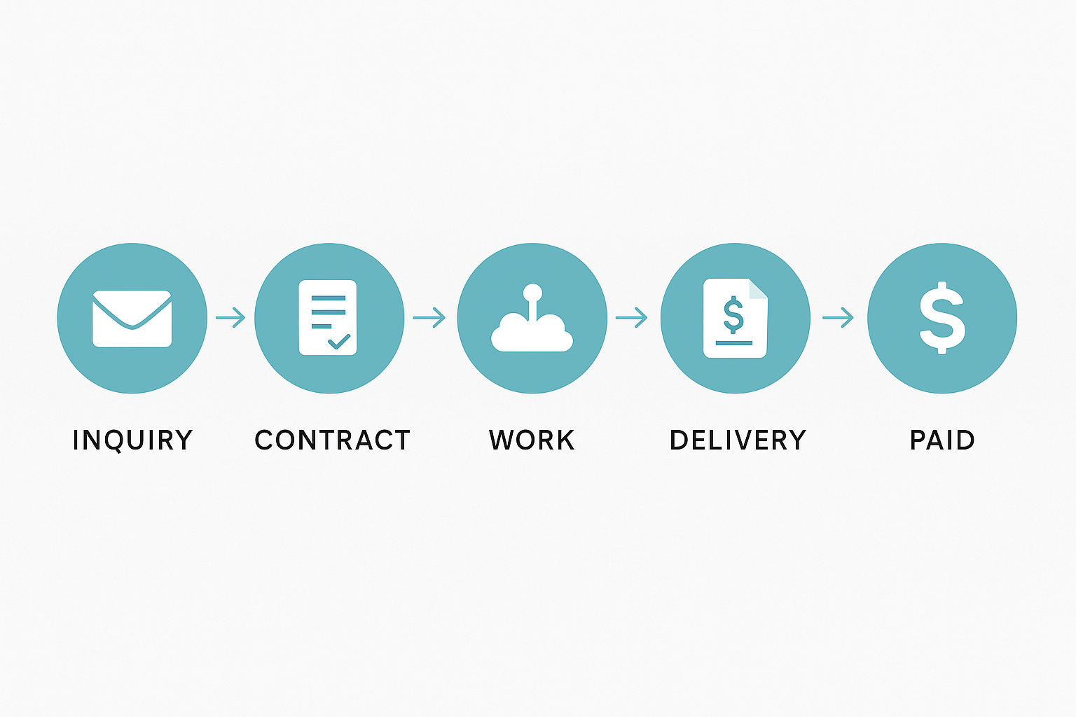 Timeline-style visual: Inquiry → Contract → Work → Delivery → Invoice → Paid