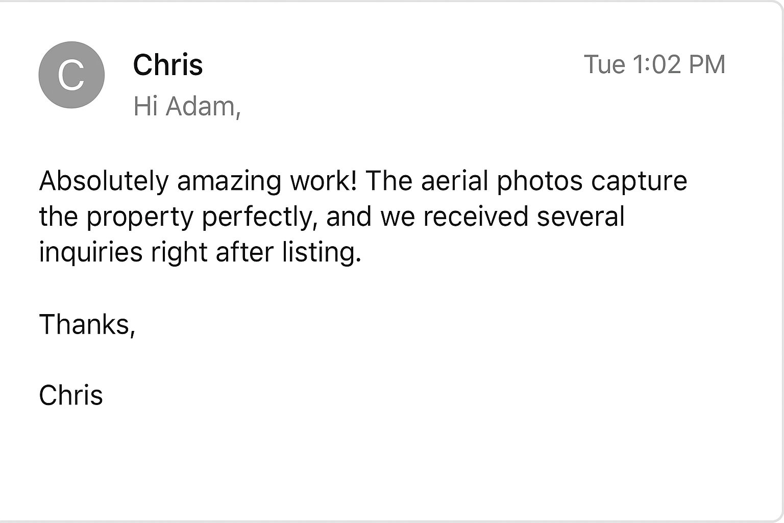 “Your drone photos made my listing stand out—sold in 3 days with 2 offers over asking!”