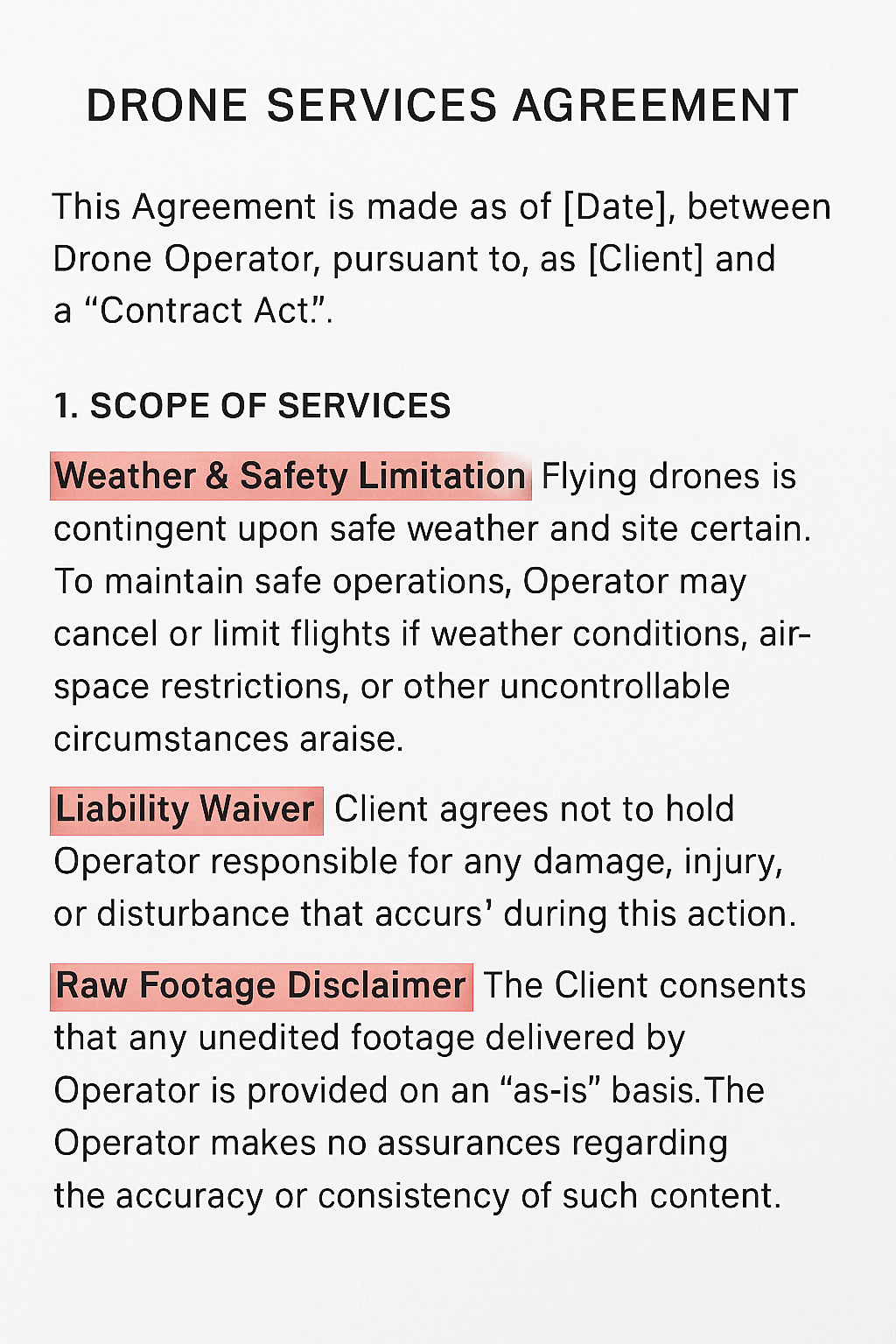 Flying drones comes with risk—both to your equipment and to others. Professional pilots protect themselves and their clients with proper insurance coverage and clear liability protection.