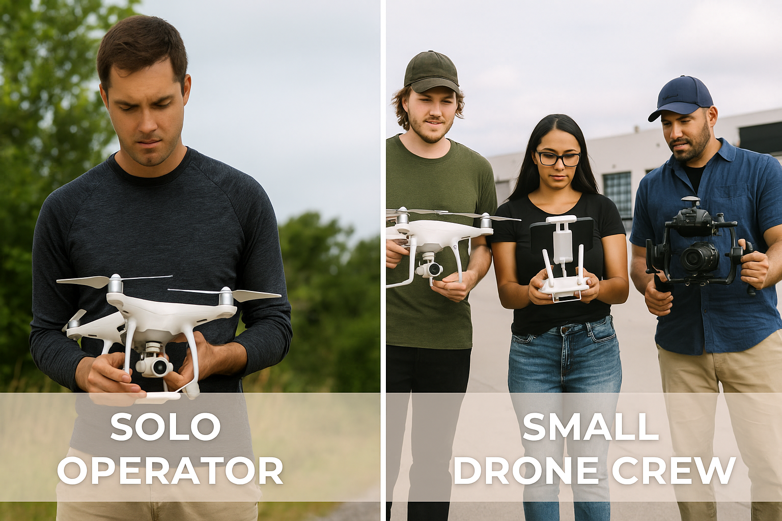Side-by-side image: Solo operator vs. small drone crew